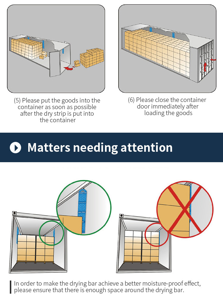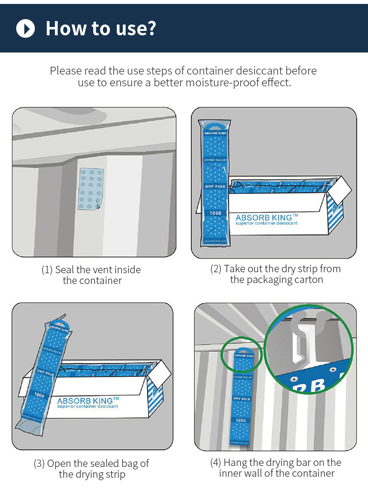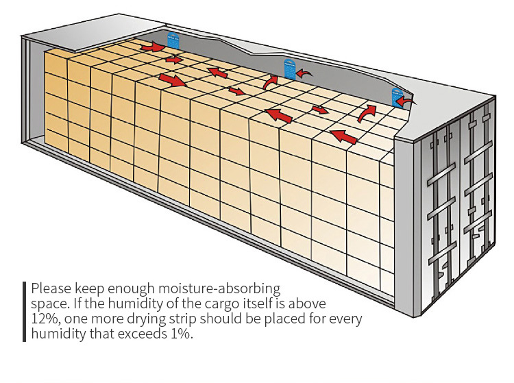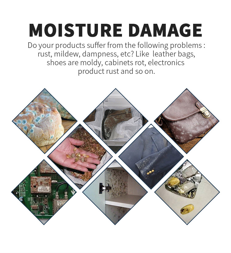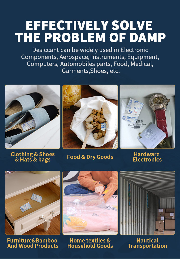 Aplikasi: Kontainer, gudang, pengiriman, logistik, pengiriman laut, ruang bawah tanah, pabrik, dan ruang besar lainnya untuk pencegahan serta penyerapan kelembapan